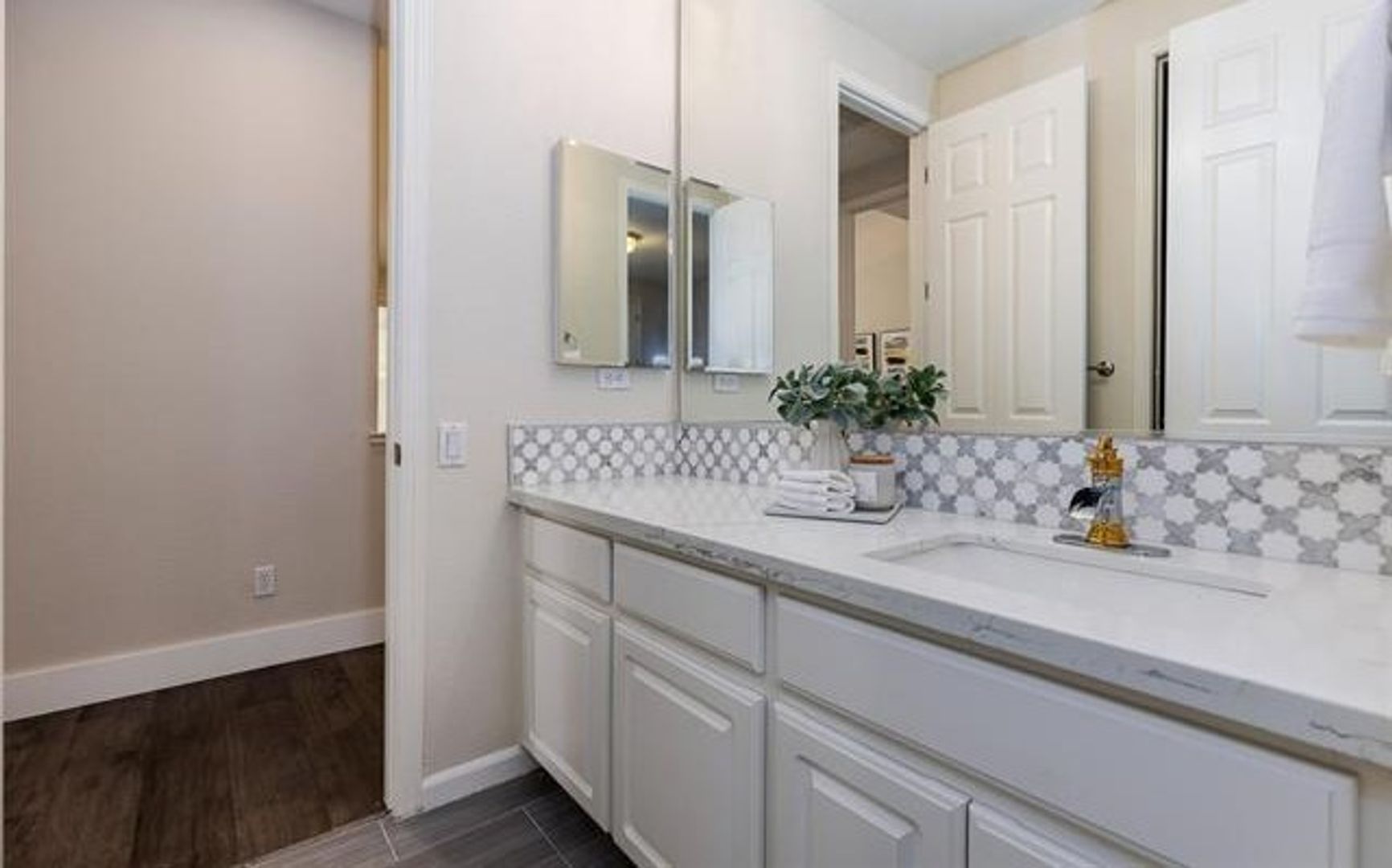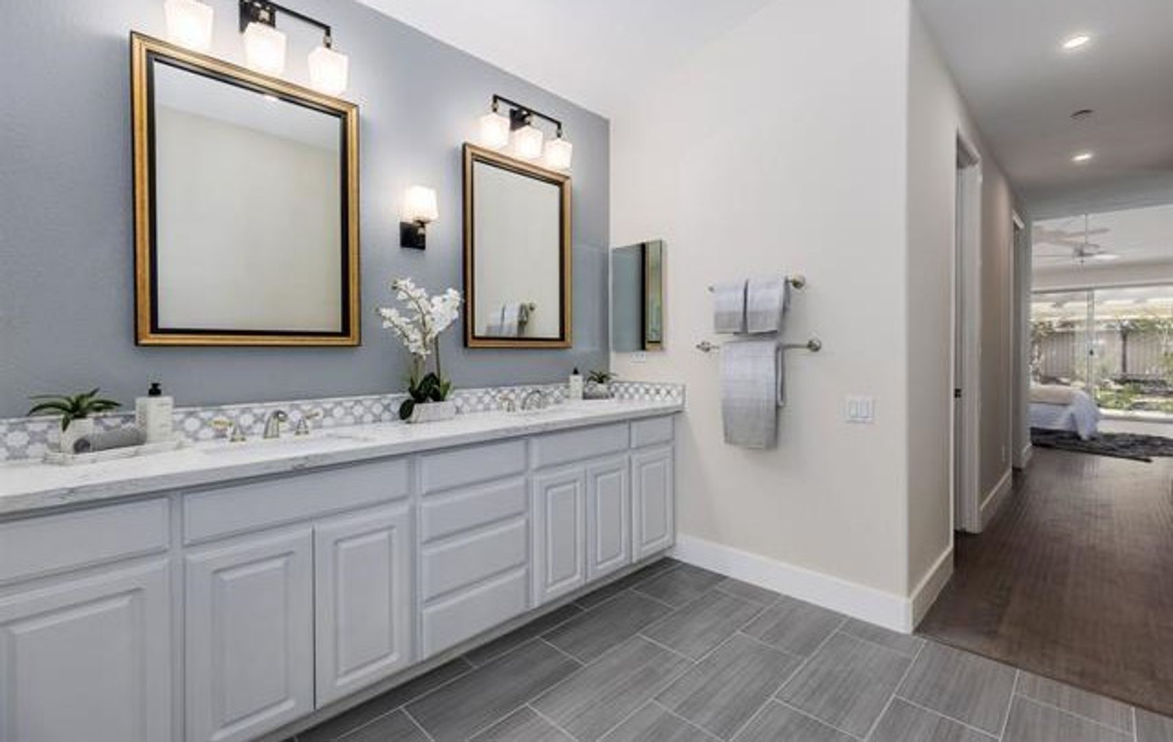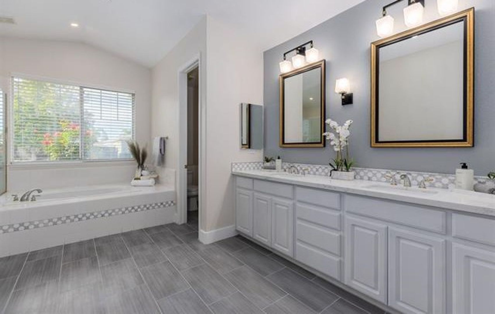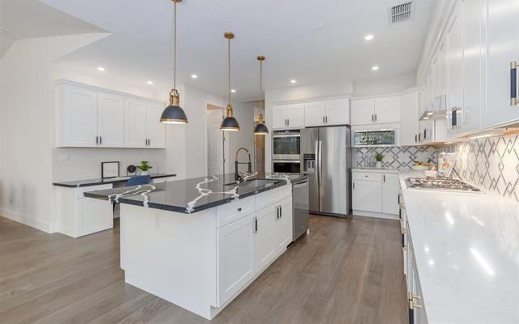 This bright and open 4-bedroom, 3-bath home has been completely updated with new flooring throughout. Located on a private corner lot, it offers a comfortable and functional layout. The spacious kitchen features granite countertops, a full backsplash, and a large center island, with plenty of room for cooking and gathering. A sunny breakfast nook opens to the family room with a modern gas fireplace, creating a warm and inviting space. The primary bedroom includes a private bath with a soaking tub, separate shower, and granite counters. All bathrooms and the laundry room also have granite finishes for a clean, updated look. Outside, the newly landscaped backyard provides plenty of space for kids to play and enjoy the outdoors.